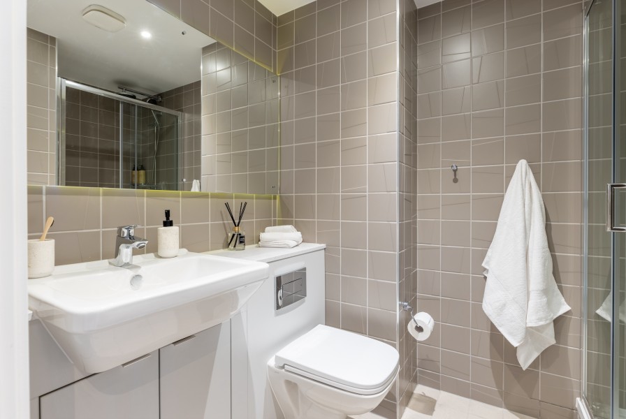 Ensuite bathroom with rainfall shower, toilet, sink, storage and mirror