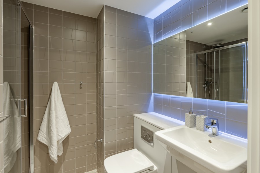 Ensuite bathroom with rainfall shower, toilet, sink, storage and mirror