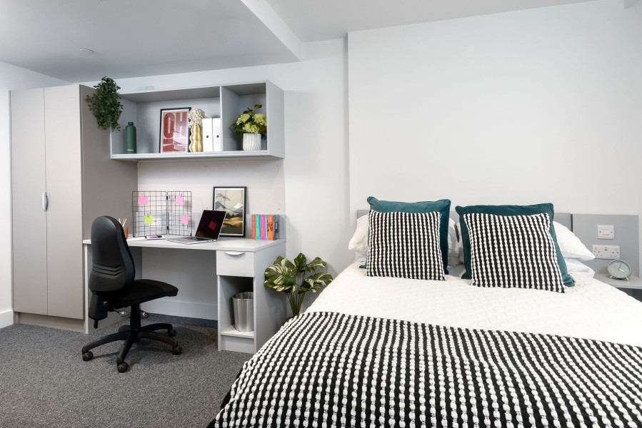 .Our Deluxe studios at true Sheffield offer a great amount of space as they're 21-22 sqm. Not only this, but with your own ensuite shower room, kitchenette and high dining table and 2 chairs, you have everything you need to eat, sleep and relax after uni!