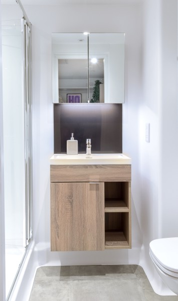 Ensuite bathroom with shower, toilet, sink, storage and mirror