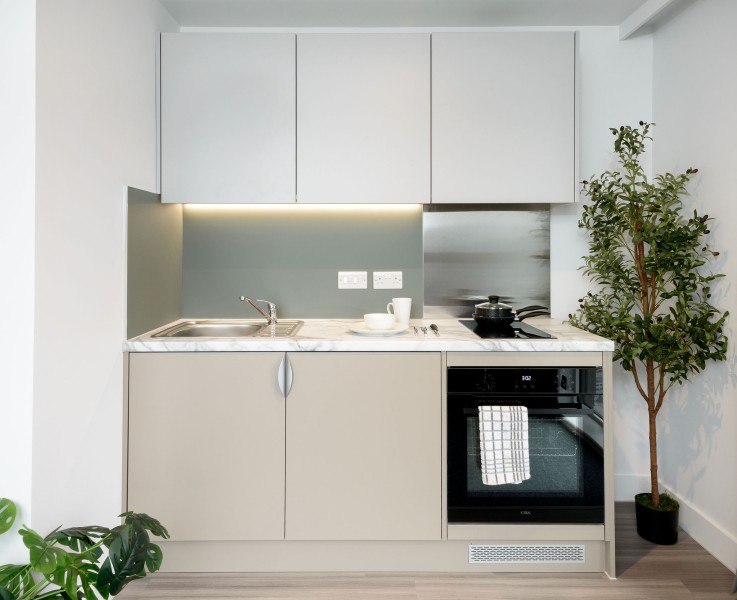 Kitchenette with oven, 2 ring hob, fridge freezer, sink and storage