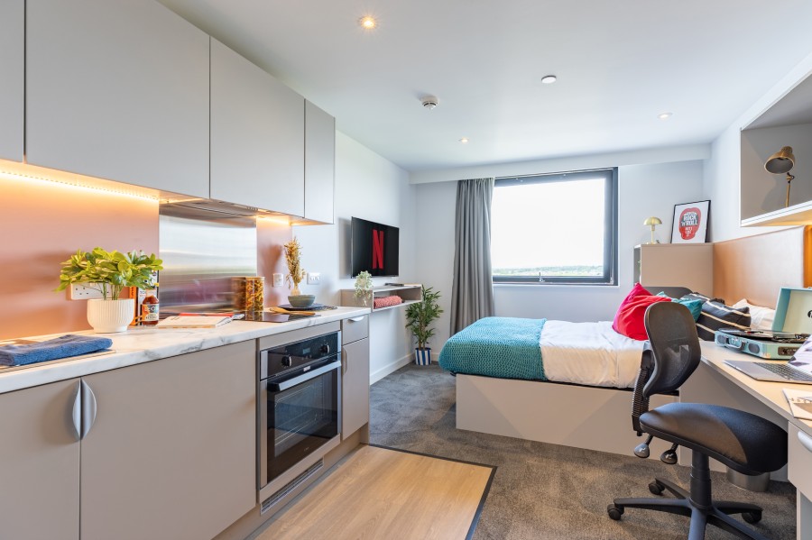 Kitchenette with oven, 2 ring hob, fridge freezer, sink and storage